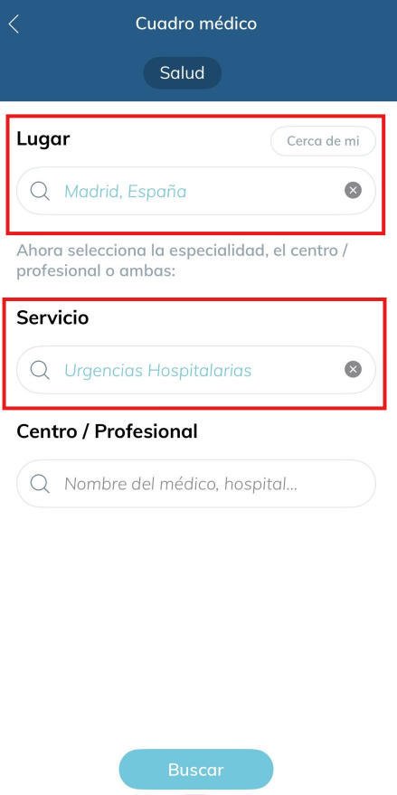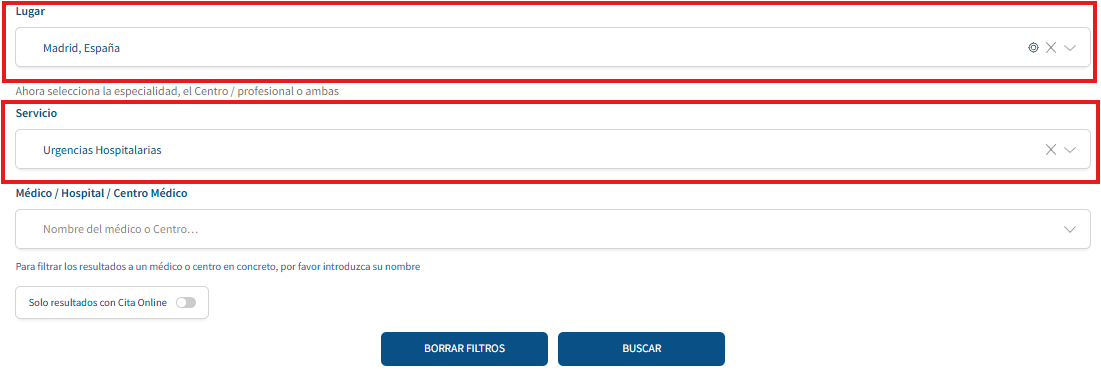 3.「Lugar」(地域)と「Servicio」(診療科)を入力⇒「Buscar」(検索)をクリック