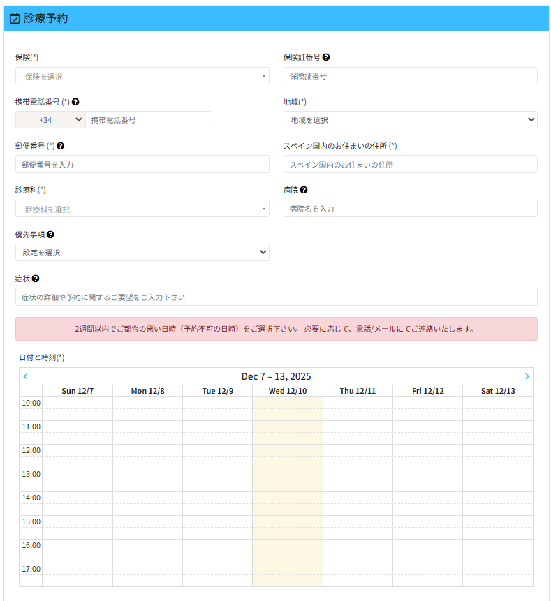 直近の予約は埋まっていることが多いので、急ぐ場合は Urgencia(救急) を受診しましょう。